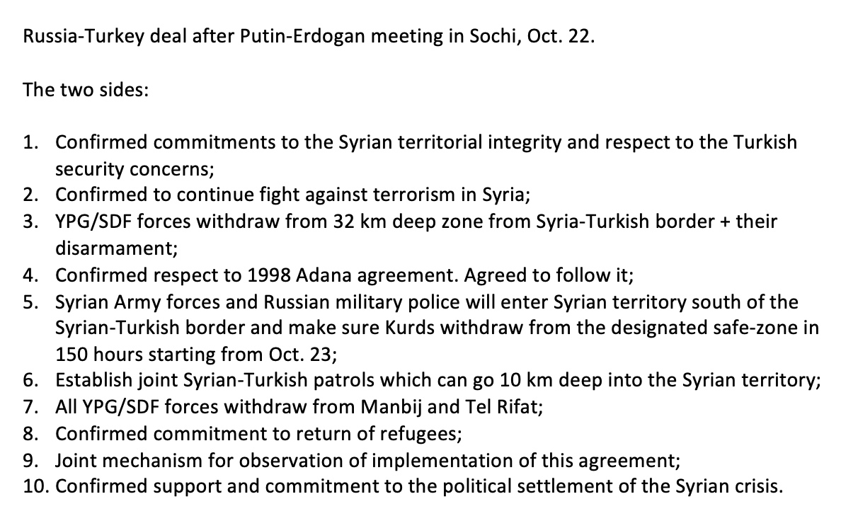 - Ab dem 23. Oktober 2019 um 12.00 Uhr werden Einheiten der russischen Militärpolizei und des syrischen Grenzschutzes auf der syrischen Seite der syrisch-türkischen Grenze außerhalb des Einsatzgebietes der Operation Friedensquelle eingesetzt. Sie werden den Abzug der kurdischen Einheiten und ihrer Waffen auf eine Linie 30 km von der syrisch-türkischen Grenze aus unterstützen, der ab dem 23. Oktober 2019 um 12.00 Uhr innerhalb von 150 Stunden abgeschlossen werden soll. Ab dem Moment beginnen auf einer Tiefe von 10 km von der Grenze im Westen und Osten des Einsatzgebiets der Operation Friedensquelle gemeinsame russisch-türkische Patrouillen, mit Ausnahme der Stadt Kamishli.